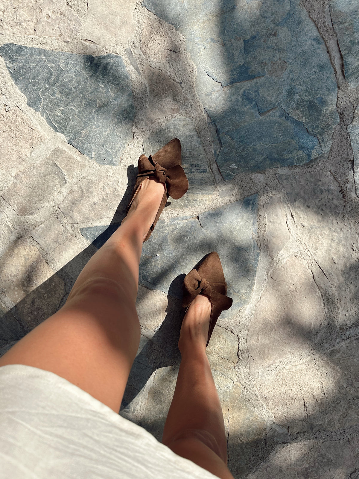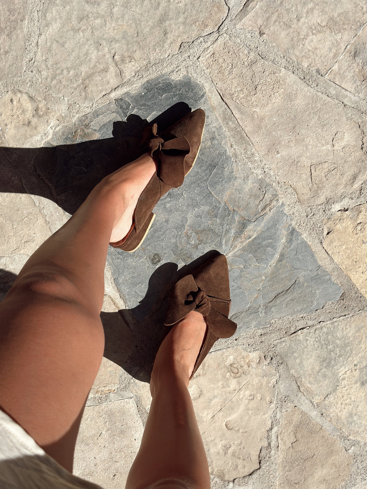 La babucha VERONA está confeccionada en cuero reno café moro, suave al tacto y flexible, perfecta para acompañarte todo el día. Su diseño minimalista con delicado lazo aporta un toque femenino y atemporal.