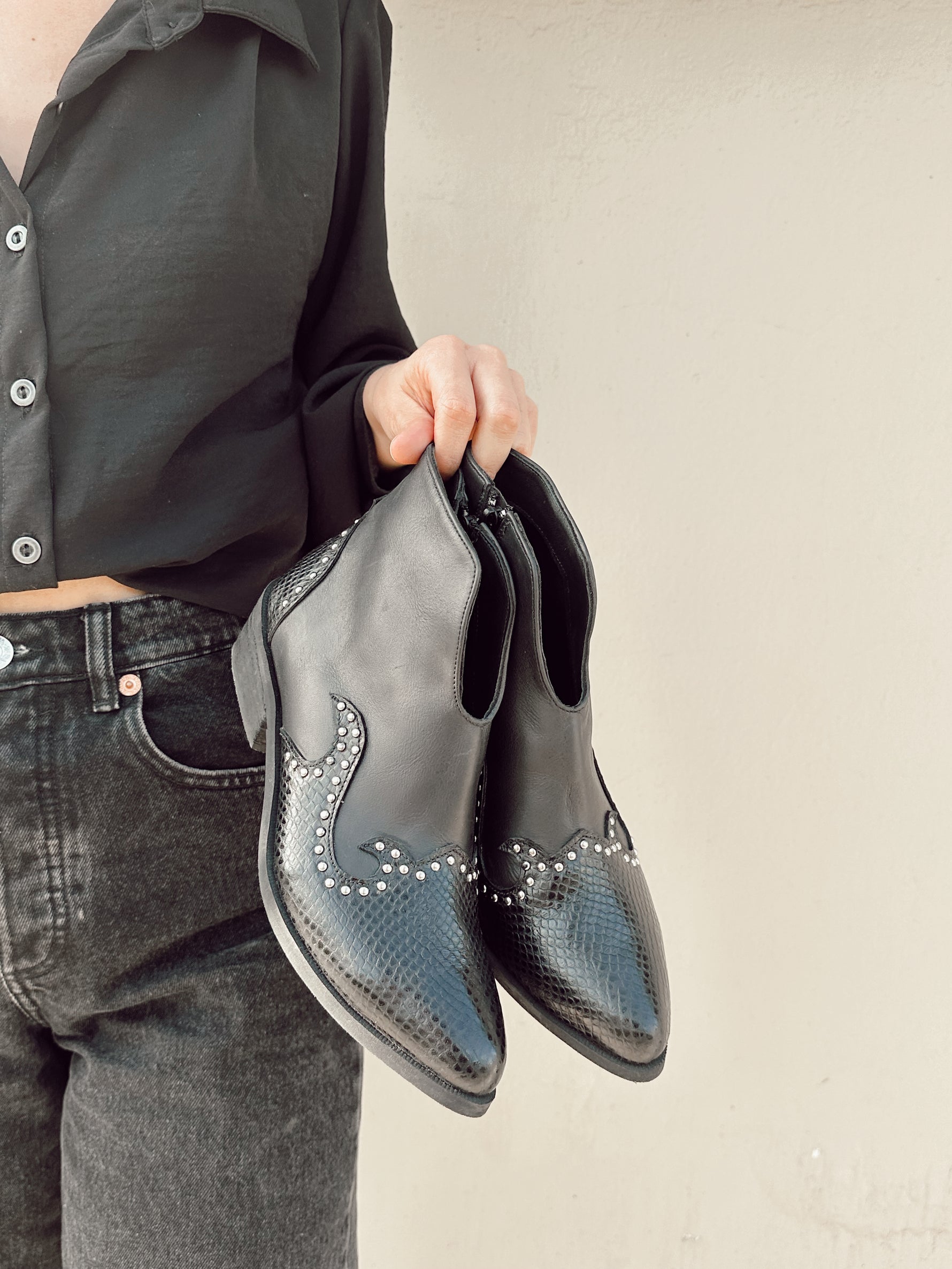 Nuestro botín Sarah es la fusión perfecta entre carácter y elegancia. Diseñado en cuero negro con textura tipo reptil en la punta, detalles metálicos. Este modelo destaca por su silueta estilizada y su actitud única. Ideal para elevar cualquier outfit, desde un look casual hasta uno más osado.