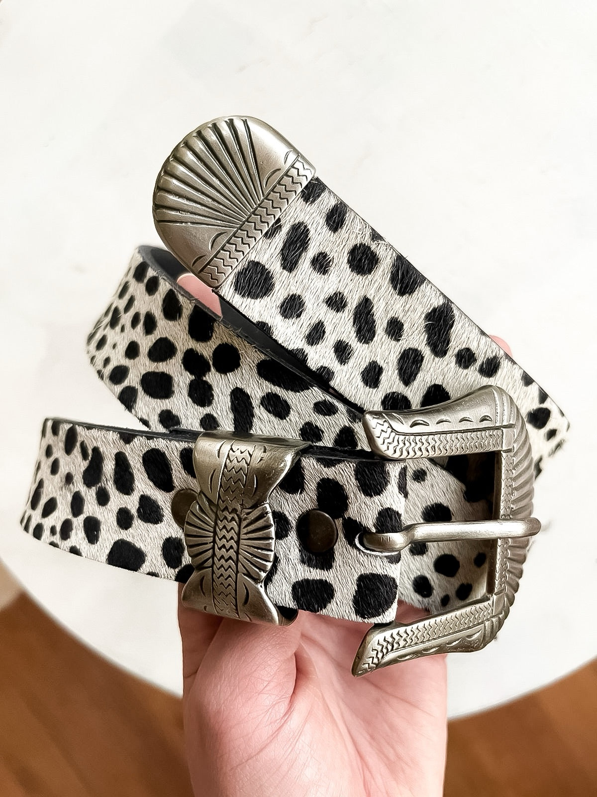 Cinturón de cuero textura pelo, color blanco con puntos negros.