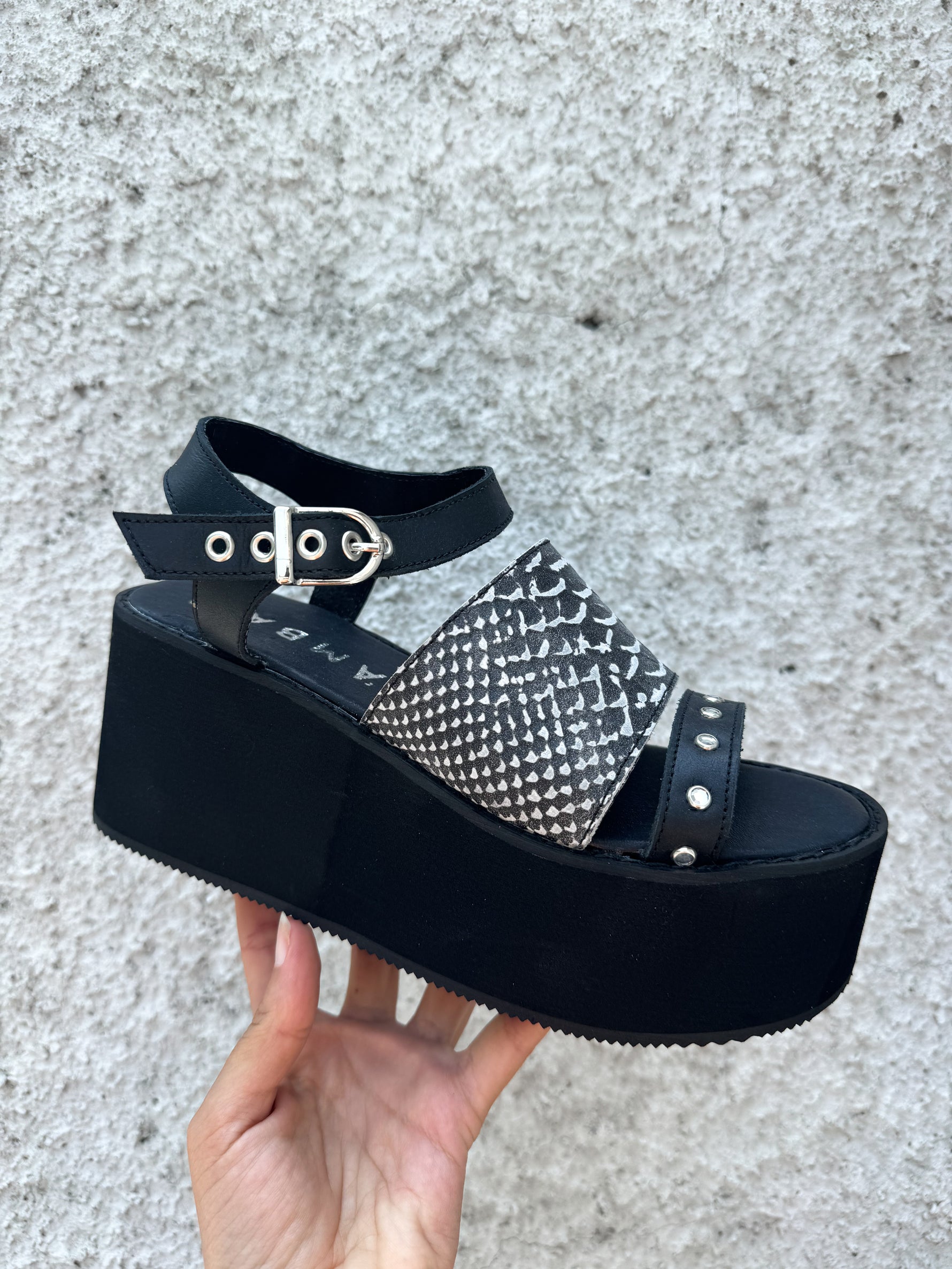 Sandalia alta de de cuero negro croco y una combinación de blanco y negro 🤩